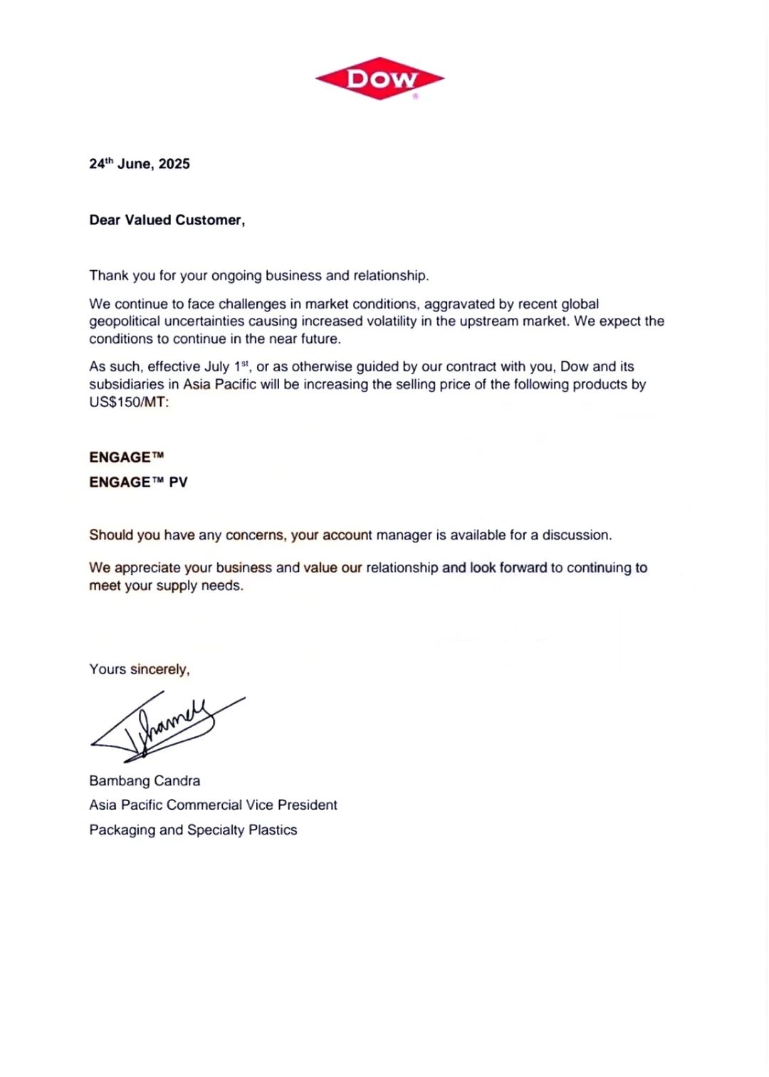 ▶▶陶氏:陶氏6月24日发布公告表示,而近期全球地缘政治不确定性加剧了上游市场的波动,7月1日起,亚太地区产品每吨涨价150美元(约1075元/吨)