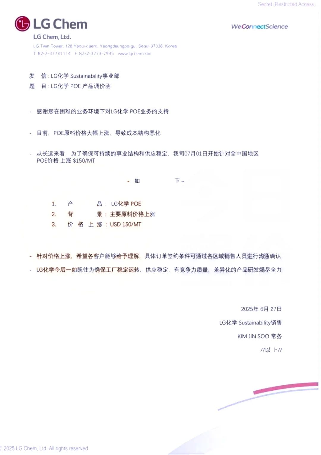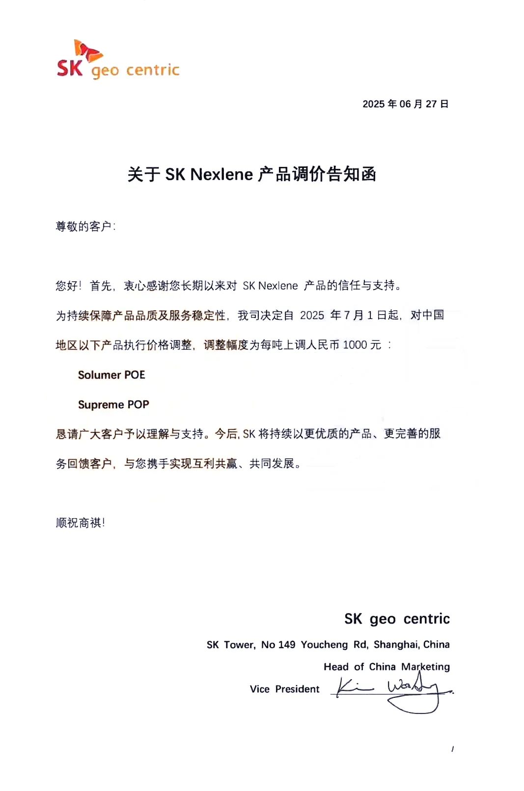 SK:Solumer POE,上调价100美元/吨,生效2025年2月17日,受市场波动影响。