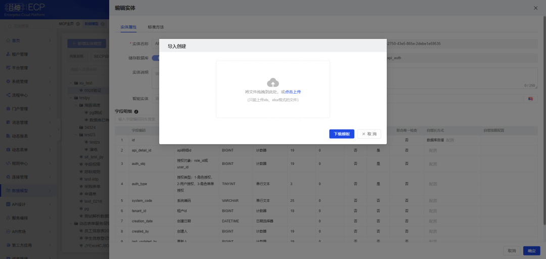 数据模型创建一键化:支持表格导入自动生成实体数据,替代传统逐行手动录入模式。大幅压缩重复操作时间,规避输入疏漏,为数据初始化、批量更新提供“快车道”。