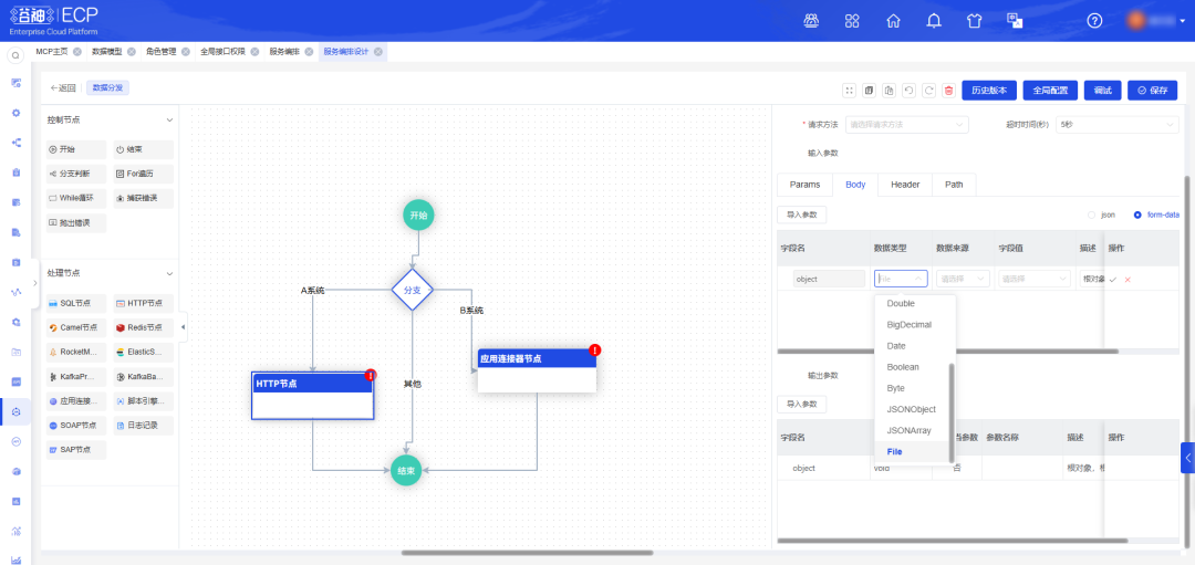 支持文件数据类型集成,支持FTP协议:服务编排HTTP节点支持上传文件自动转结构化数据,无需人工手动格式转换。无论是表单提交数据文件,还是对接外部API获取文件,数据可直接流入后续节点处理,既打破“接收-处理”的人工依赖瓶颈,又降低手动解析的错误率与开发成本。